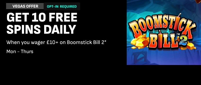 *Opt-in required. Free Spins: max 10 per day 16/02/26 - 19/02/26. Boomstick Bill 2 only (3 day expiry, 10p per spin). T&Cs apply.